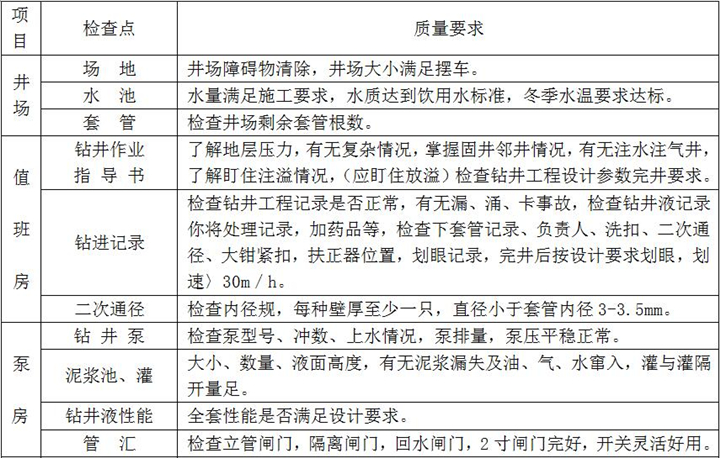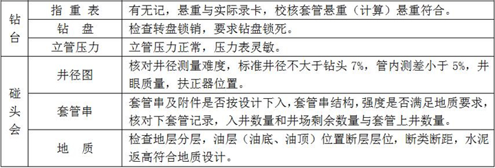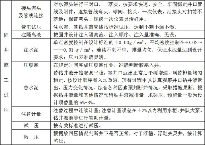 2、固井施工:按設(shè)計(jì)注入隔離液,水泥漿壓膠塞,頂替鉆井液、碰壓、試壓完成、固井施工過(guò)程檢查點(diǎn)項(xiàng)及要求如下: